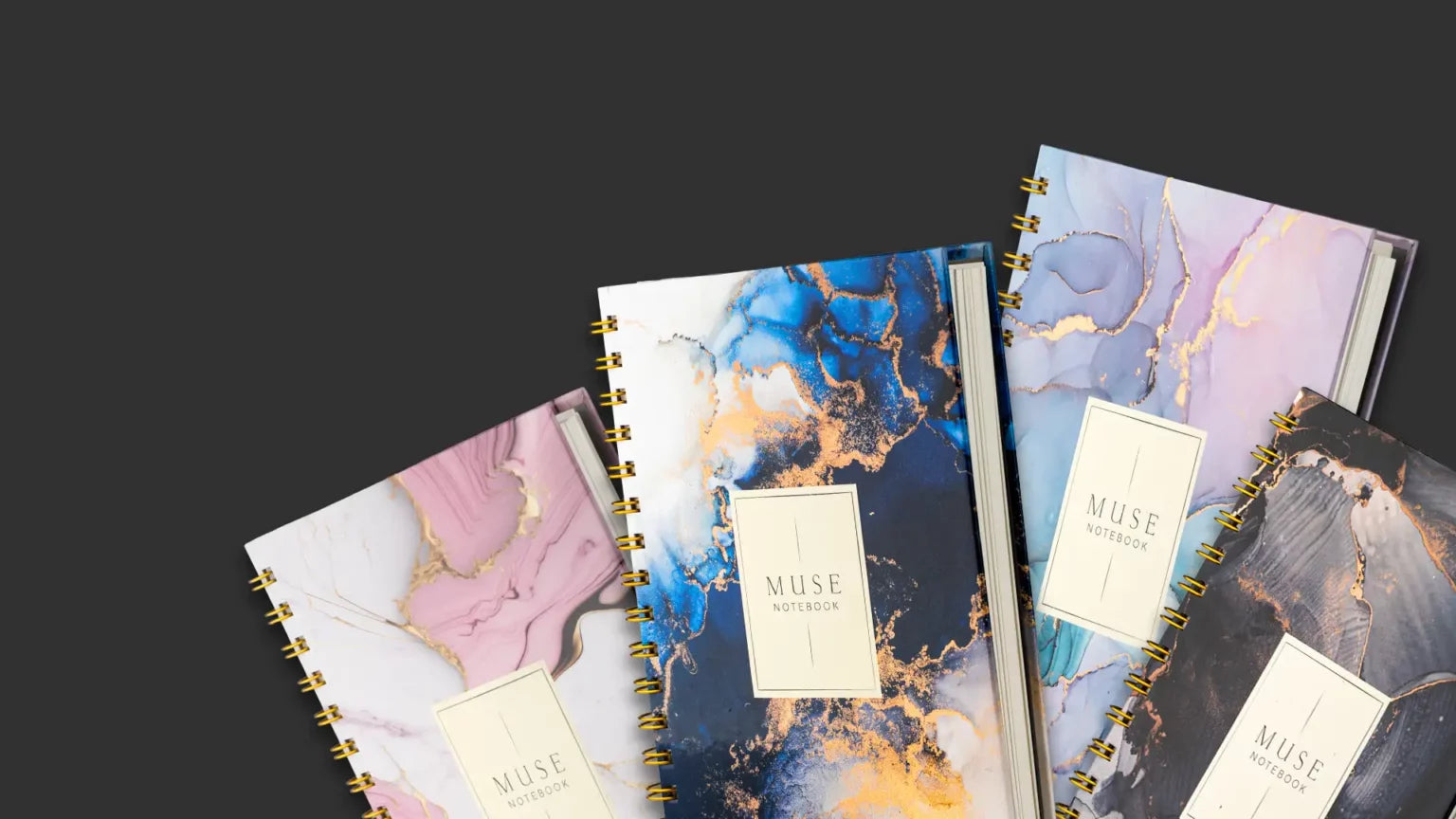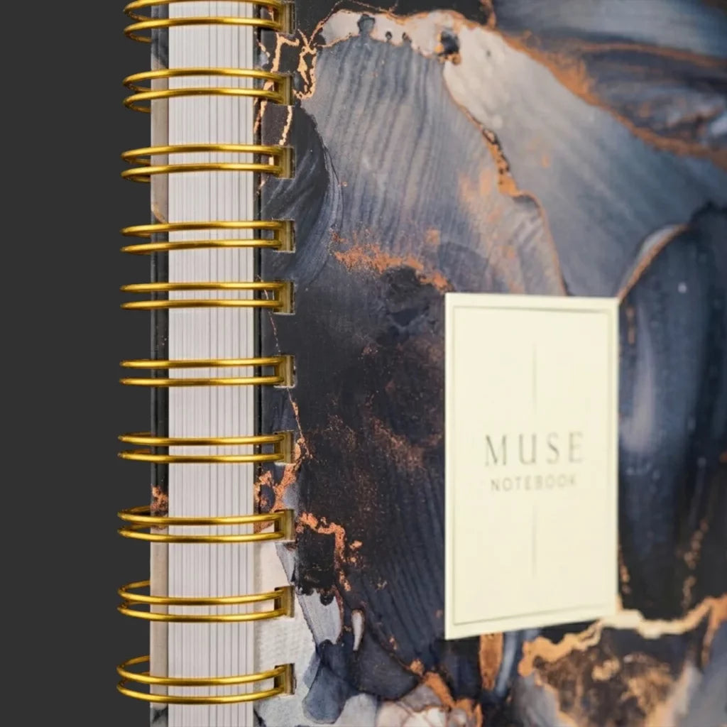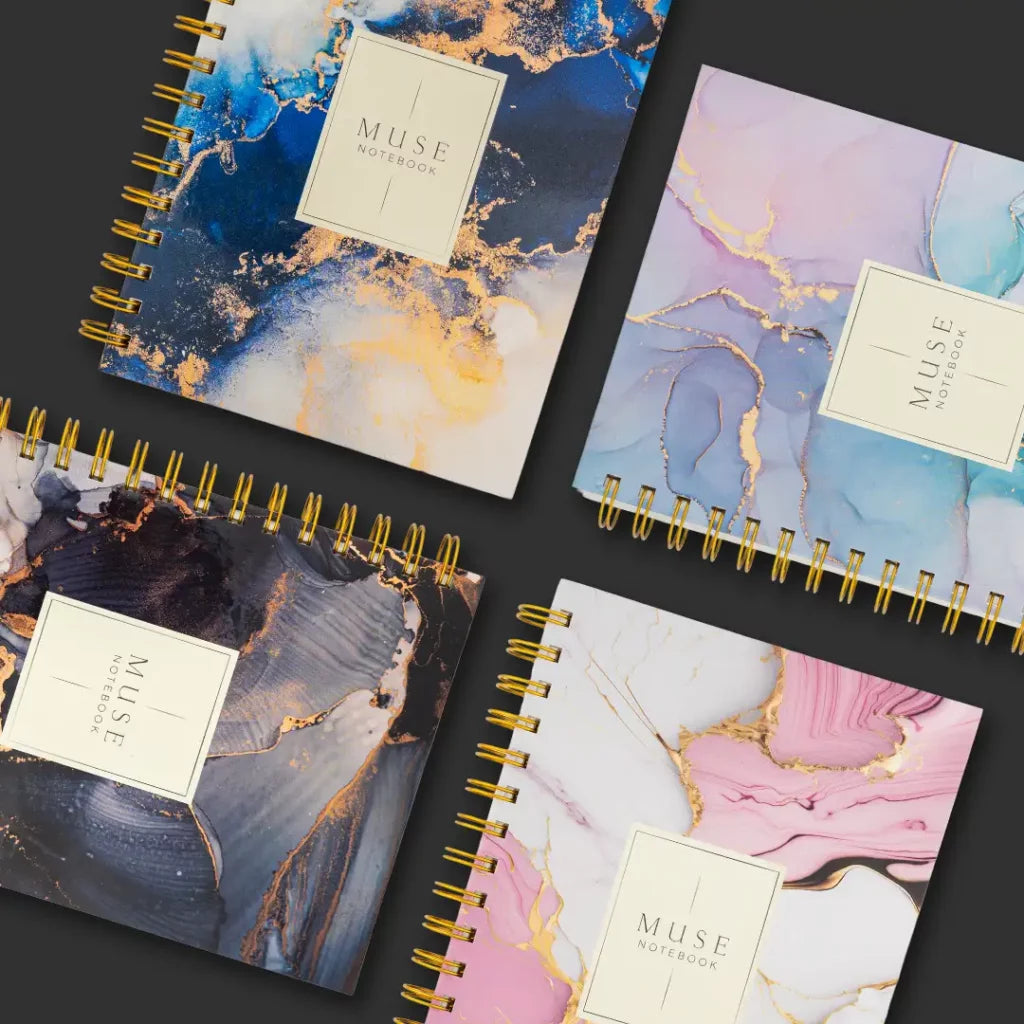 Elevate your everyday writing with the Muse Notebook, featuring 4 stunning marble-themed covers and elegant golden wire binding. Designed for both style and function. Perfect for smooth, effortless writing.