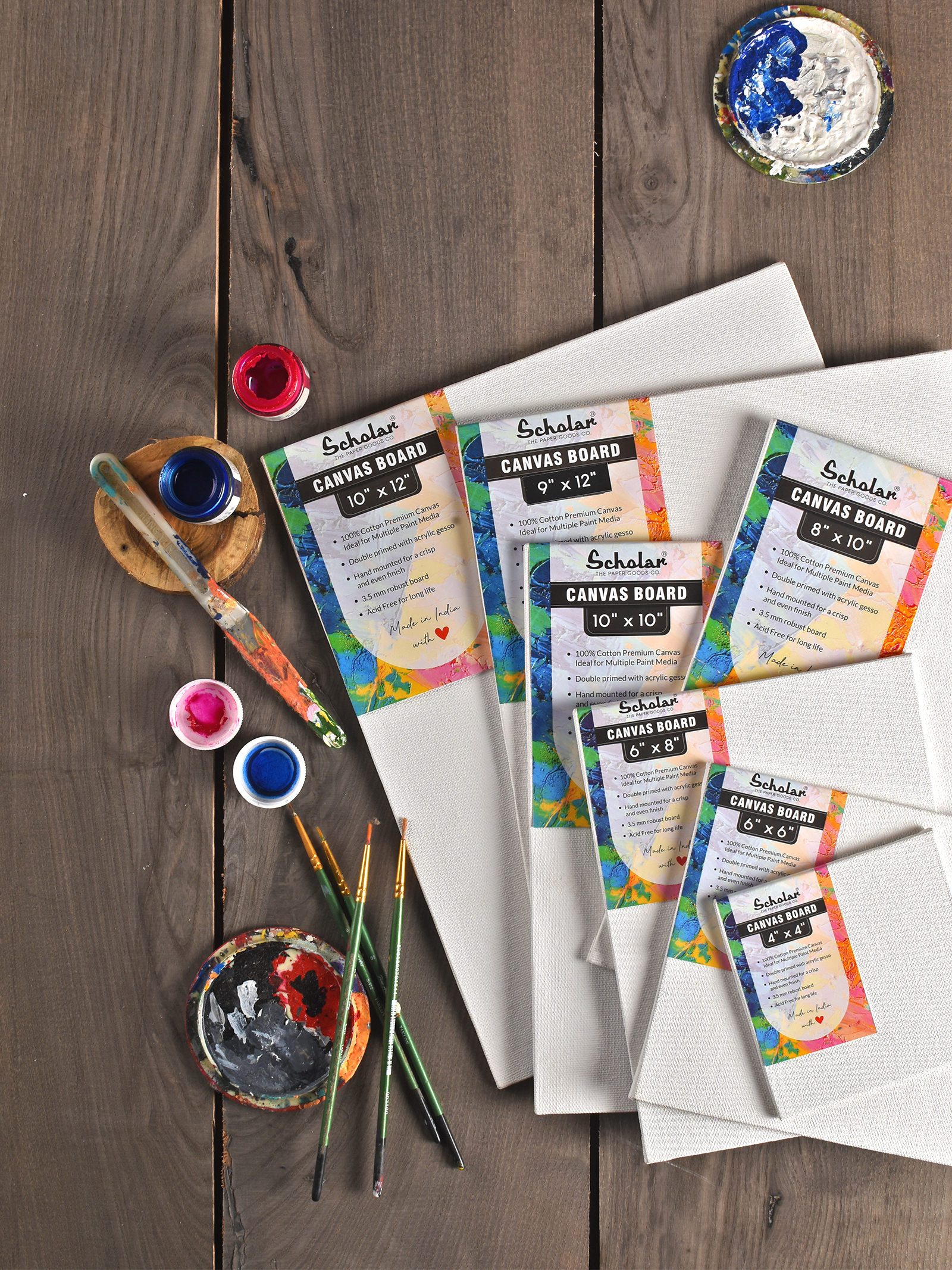 Whether you require a big canvas board or a small canvas board or a mini canvas board, we have you covered. Ranging from 4 x 4 inches i.e. to 18 x 24 inches i.e. the Scholar Canvas Board Sizes are more than sufficient to cater to your varied needs. Uplift your creative game & never be short of canvas painting ideas with our multitude of sizes.